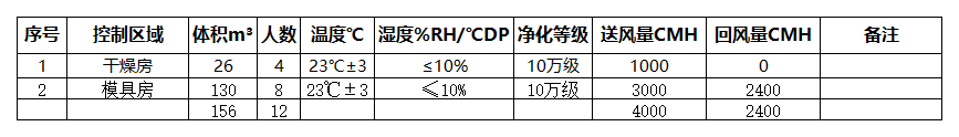 本方案除濕區(qū)域含:干燥房和模具房兩個(gè)大區(qū)域,基于甲供參數(shù)及設(shè)計(jì)選型依據(jù),兩個(gè)區(qū)域內(nèi)分別為4和8人,干燥房內(nèi)有腐蝕性揮發(fā)氣體氟化氫HF,為保護(hù)機(jī)組及域內(nèi)設(shè)備,本區(qū)域采取全新風(fēng)送風(fēng)+回風(fēng)全排方式控制,模具房采用回風(fēng)設(shè)計(jì)。
