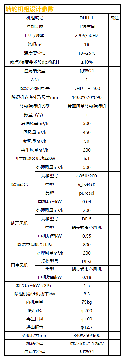 本方案除濕區(qū)域含:干燥區(qū)一個(gè),基于甲供參數(shù)表及設(shè)計(jì)選型依據(jù),該區(qū)域采用一臺(tái)送風(fēng)量500CMH單轉(zhuǎn)輪除濕機(jī)組控制。