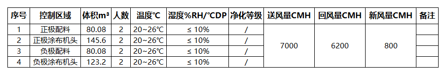 本項(xiàng)目為直膨機(jī)組改造項(xiàng)目,含正極配料 、正極涂布機(jī)頭 、負(fù)極配料 、負(fù)極涂布機(jī)頭四個(gè)區(qū)域,經(jīng)現(xiàn)場(chǎng)勘測(cè),新風(fēng)量為 680CMH,房間密封性良好,管路漏風(fēng)小,且無(wú)大的排風(fēng)設(shè)備;所以制定送風(fēng)量 7000CMH,新風(fēng)量 800CMH, 回風(fēng)量 6200CMH 的改造方案,管道漏風(fēng)率按 2%計(jì)算。