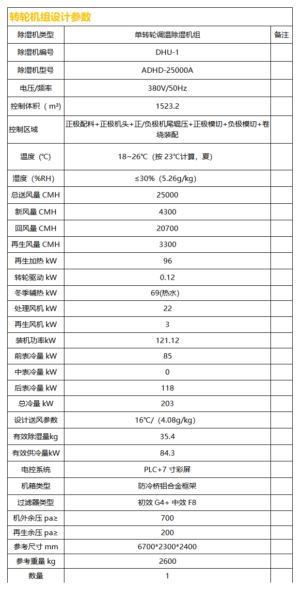 阿斯麥25000風量單轉輪調溫除濕機組采用中高溫再生轉輪,其再生溫度在80℃-120℃時可穩定運行,以30%濕度的控濕能力,濕度反饋自動巡航,自動調節再生加熱溫度,賦能鋰電池車間生產環境,為鋰電池保駕護航。