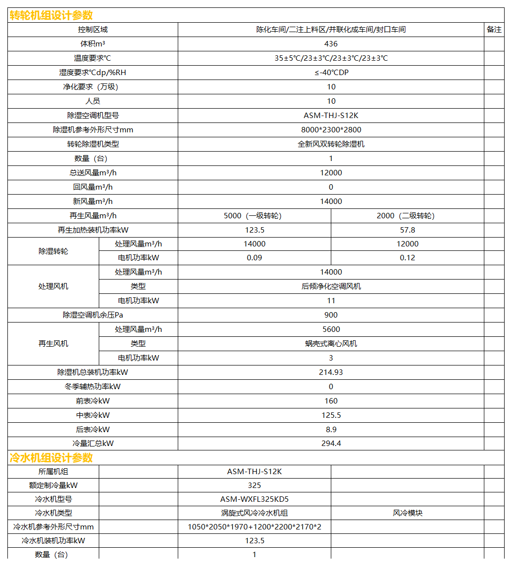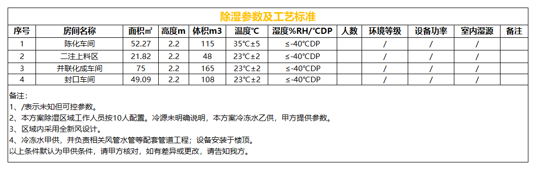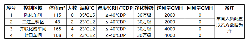 本方案除濕區(qū)域含:陳化車間、二注上料區(qū)、并聯(lián)化成車間、封口車間四個區(qū)域,基于甲供參數(shù)表及設計選型依據(jù),除濕區(qū)域采用一臺送風量12000CMH全新風雙轉(zhuǎn)輪除濕機組控制,該機組送風溫度可調(diào),送風露點-55℃DP(含濕量0.026g/kg干)。