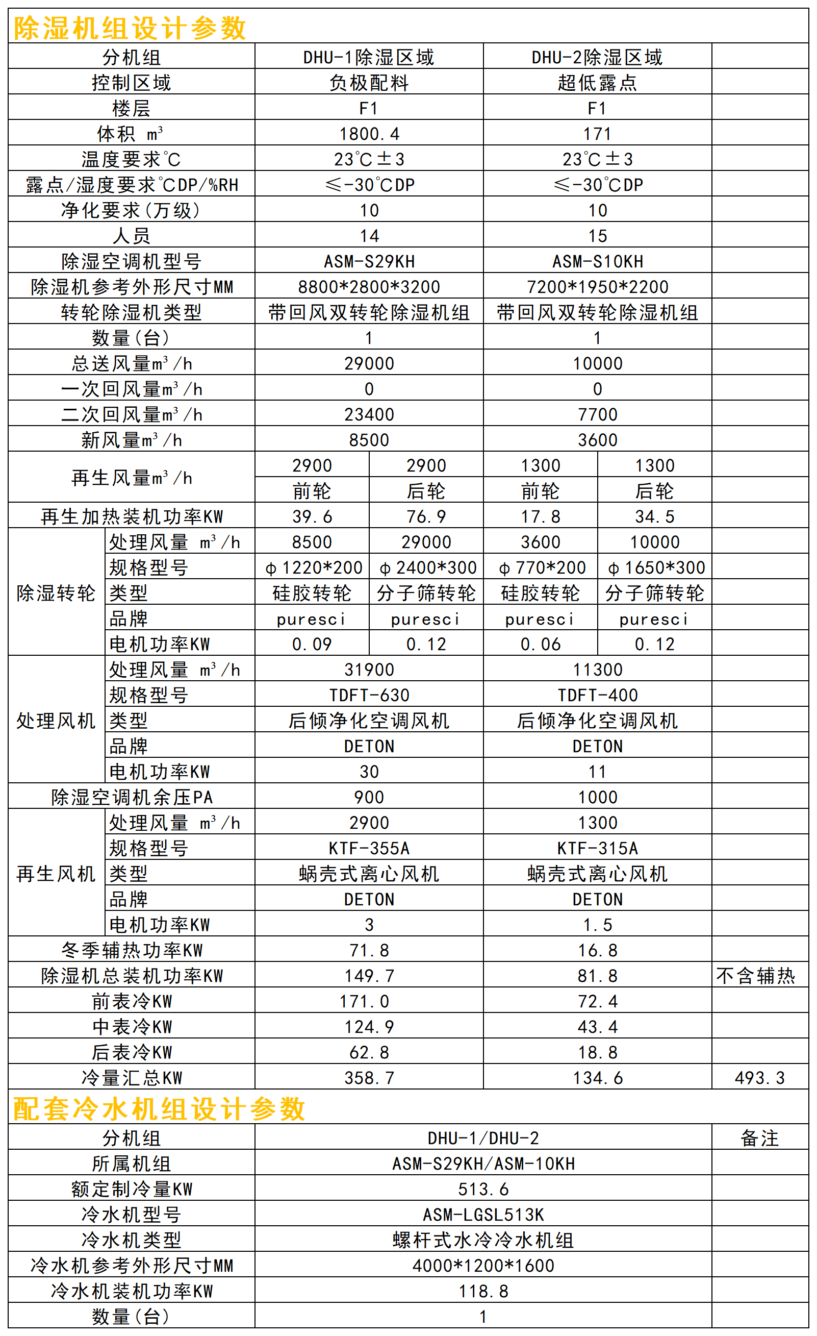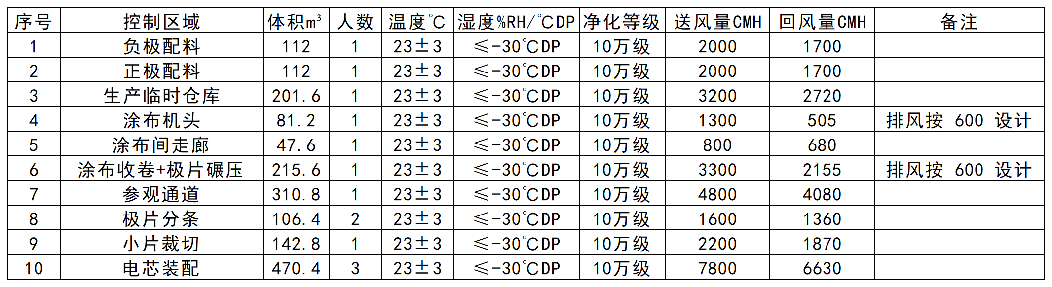DHU-1除濕區域含:負極配料、正極配料、生產臨時倉庫、涂布機頭、涂布機尾、涂布間走廊、極片碾壓、參觀通道、極片分條、小片裁切及電芯裝配十一個區域,基于甲供參數及設計選型依據,此除濕區域采用一臺送風量29000CMH,回風量23400CMH,送風露點-40℃DP雙轉輪除濕機組控制。