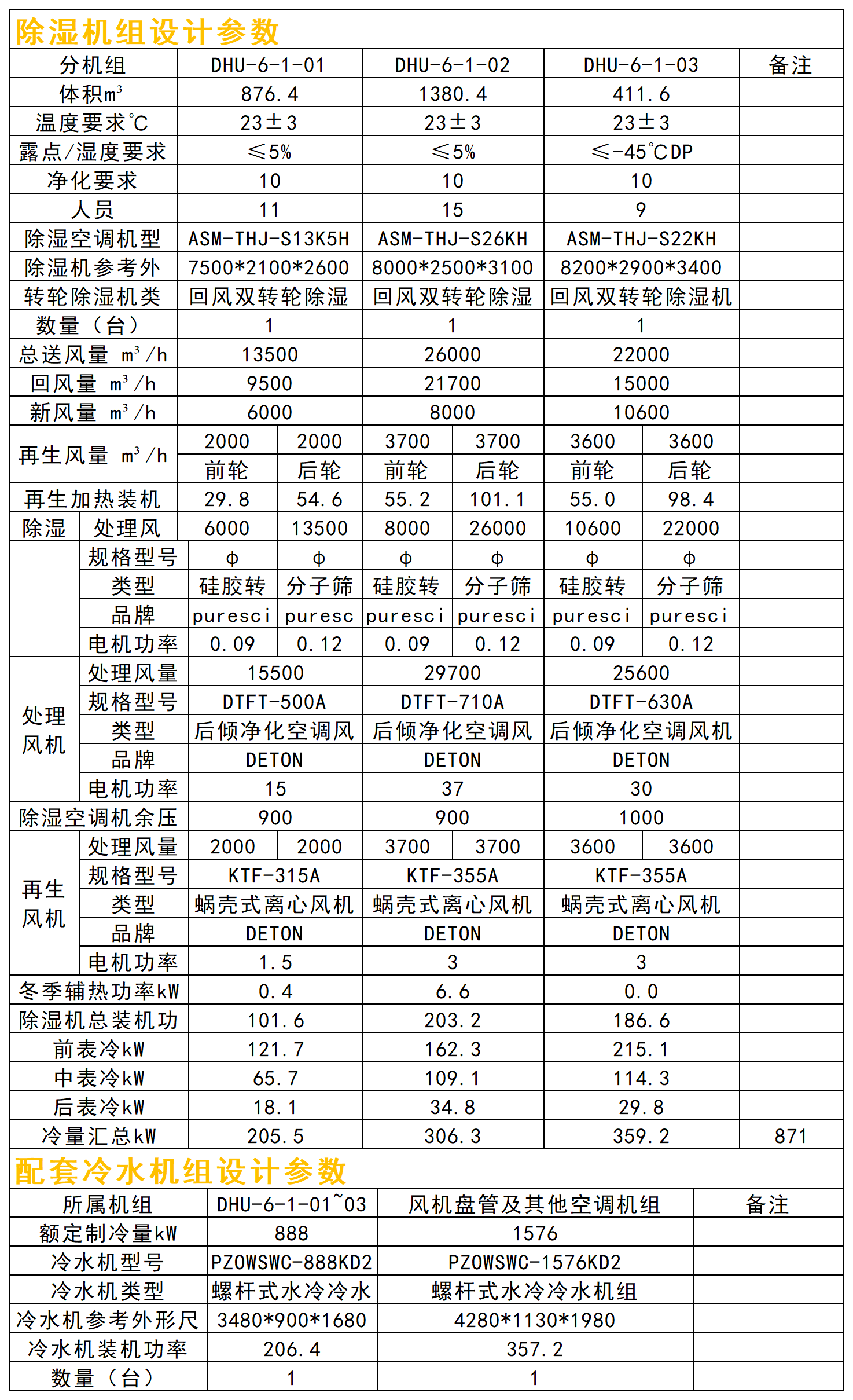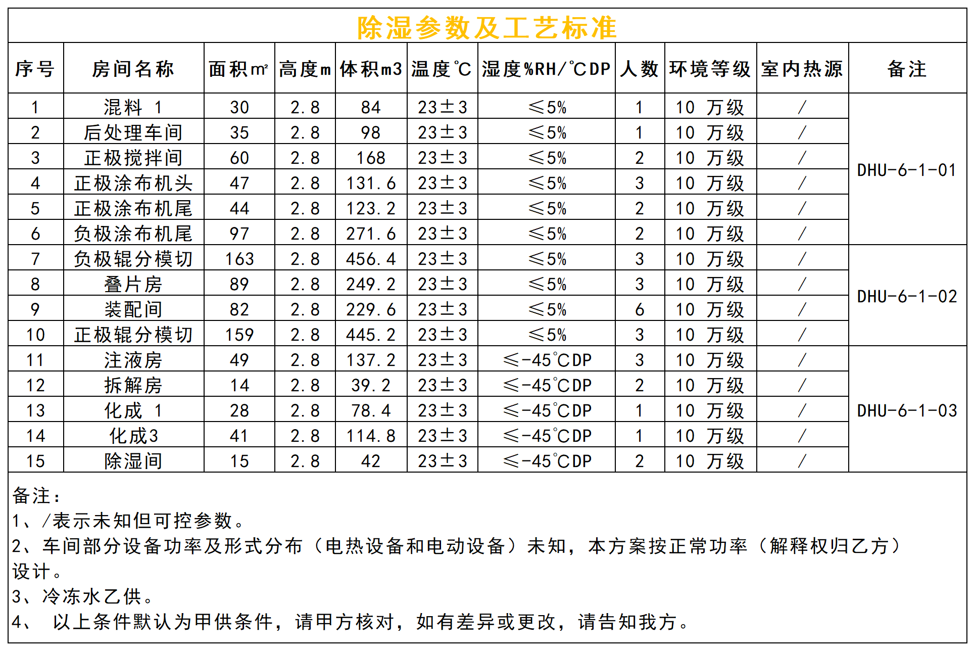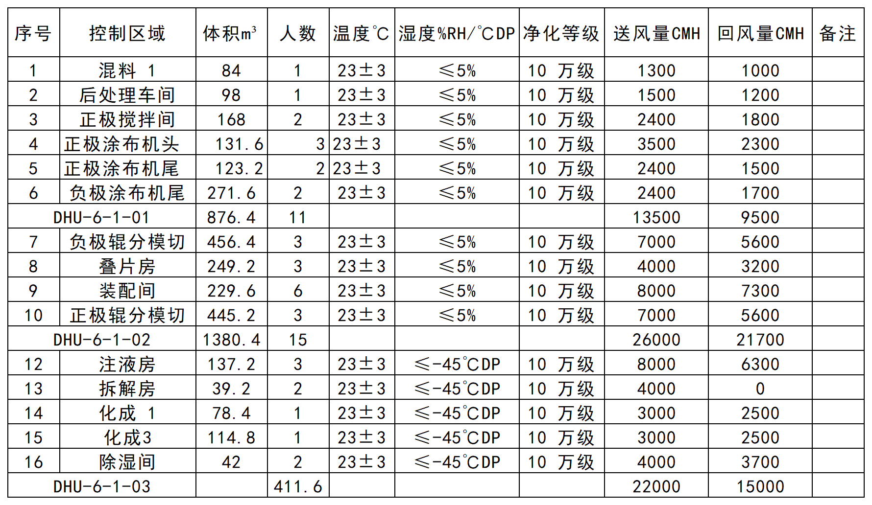 本方案除濕區(qū)域含:混料 1、后處理車間、正極攪拌間、正極涂布機頭、正極涂布機尾、負極涂布機尾、負極輥分模切、疊片房、裝配間、正極輥分模切、注液房、拆解房、化成 1、化成3、除濕間 15 個除濕區(qū)域;房間要求潔凈等級 10 萬級,所以房間所需換氣次數應不小于15 次,基于甲供參數表及設計選型依據,本除濕方案分三臺雙轉輪機組控制。