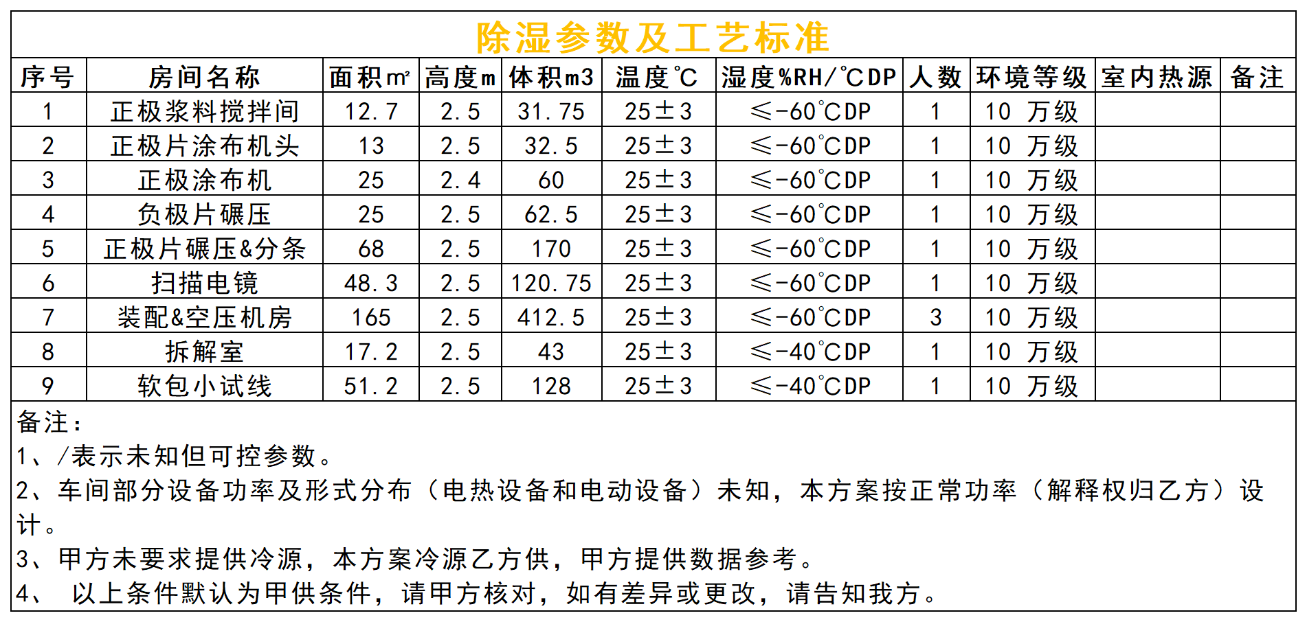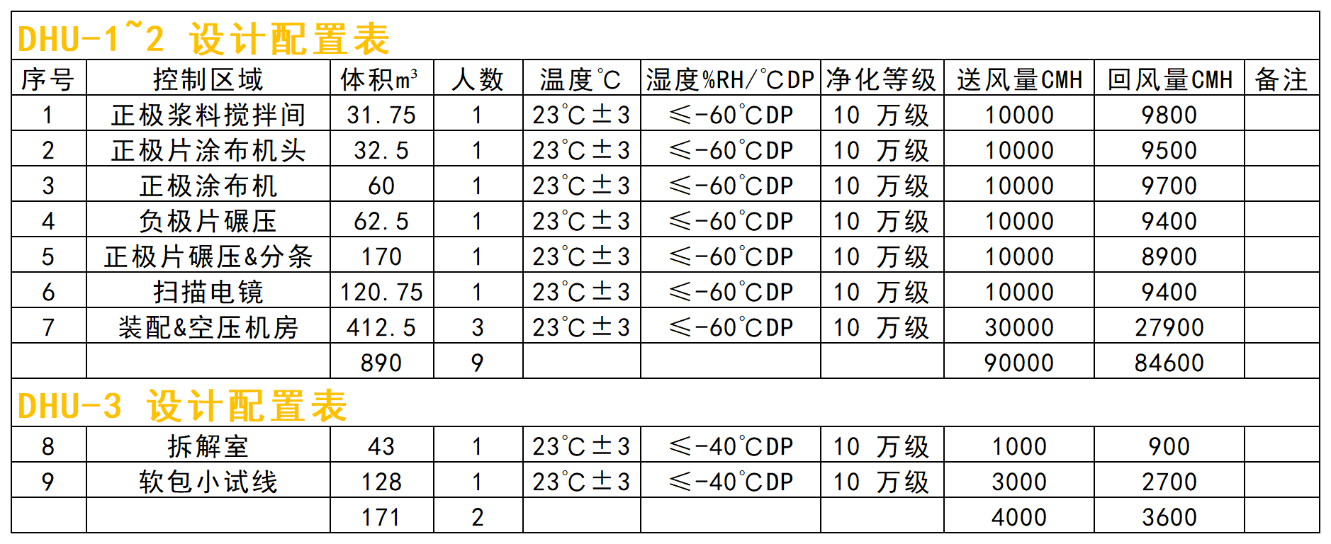 本項目除濕區域含正極漿料攪拌間、正極片涂布機頭、正極涂布機、正極片碾壓&分條、負極片碾壓、電芯裝配、壓縮空氣機房、3 樓拆解室、4 樓軟包小試線 9 個區域,分為≤-40℃DP(0.119g/kg)和≤-60℃DP(0.012g/kg)兩個濕度梯隊,基于甲供參數及設計選型依據,正極漿料攪拌間、正極片涂布機頭、正極片涂布機、正極片碾壓&分條、負極片碾壓、掃描電鏡、裝配間及空壓機房設計送風露點≤-70℃DP(0.003g/kg),其送風量 90000CMH,回風量84600CMH,新風量 14400CMH 的雙轉輪除濕機組控制,由于受轉輪大小限制,此區域分兩臺45000CMH 機組 DHU-1~2 控制;3 樓拆解室及 4 樓軟包實驗室兩個區域設計送風露點≤-55℃DP(0.022g/kg),其送風量 4000CMH,回風量 3600CMH,新風量 900CMH 的雙轉輪除濕機組 DHU-3控制。